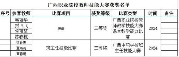 能》课程被认定为自治区级职业教育在线精品课程;教师团队(韦丽华、封飞飞、侯丽琴、陈春桃)荣获 2024 年广西职业院校教师教学技能大赛课堂教学能力赛项三等奖;韦明老师被命名为