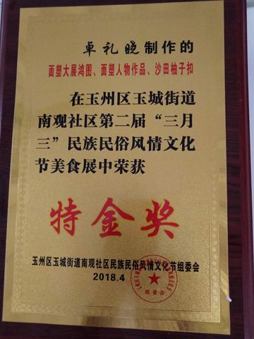 热烈祝贺我校中餐烹饪与营养膳食专业的热菜大师卓礼晓老师的面塑大展鸿图、面塑人物作品、沙田柚子扣,参加2018年玉林市玉州区玉城街道南观社区第二届“三月三”民族民俗风情文化节美食展,荣获特金奖。