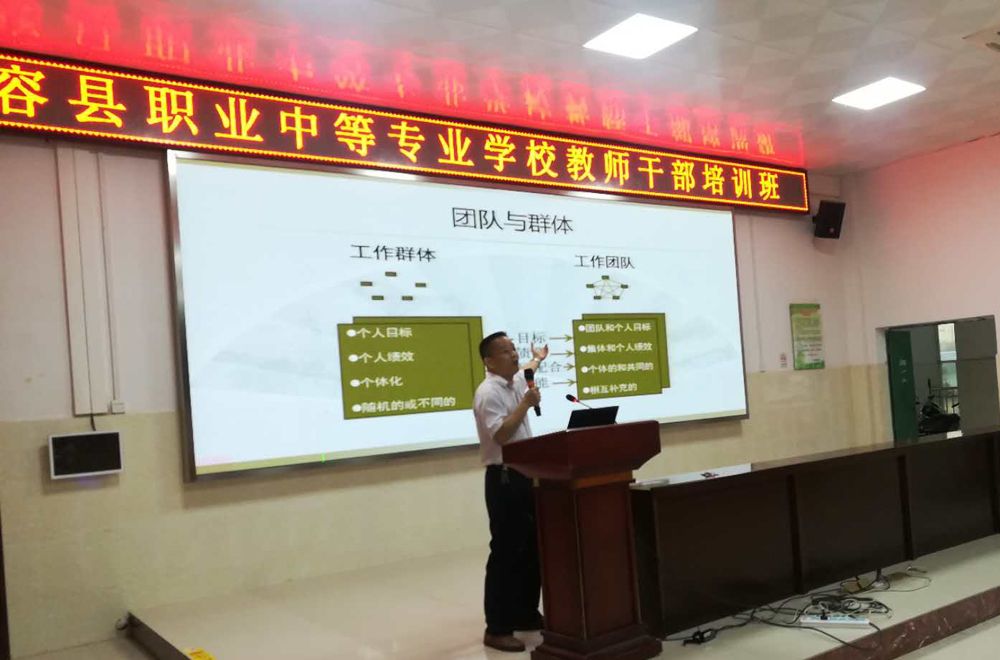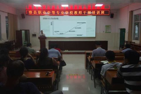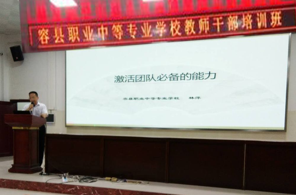 2018年 9月7日下午,在容县职业中等专业学校报告厅举行教师干部培训班,林萍校长主讲《激活团队必备的能力》,全体学校领导、工青妇领导、专业部组长、教研组长40多人参加培训。