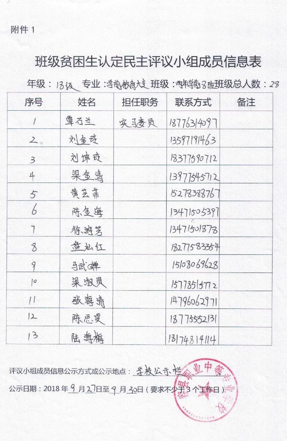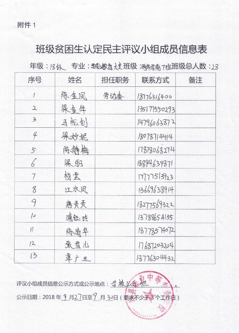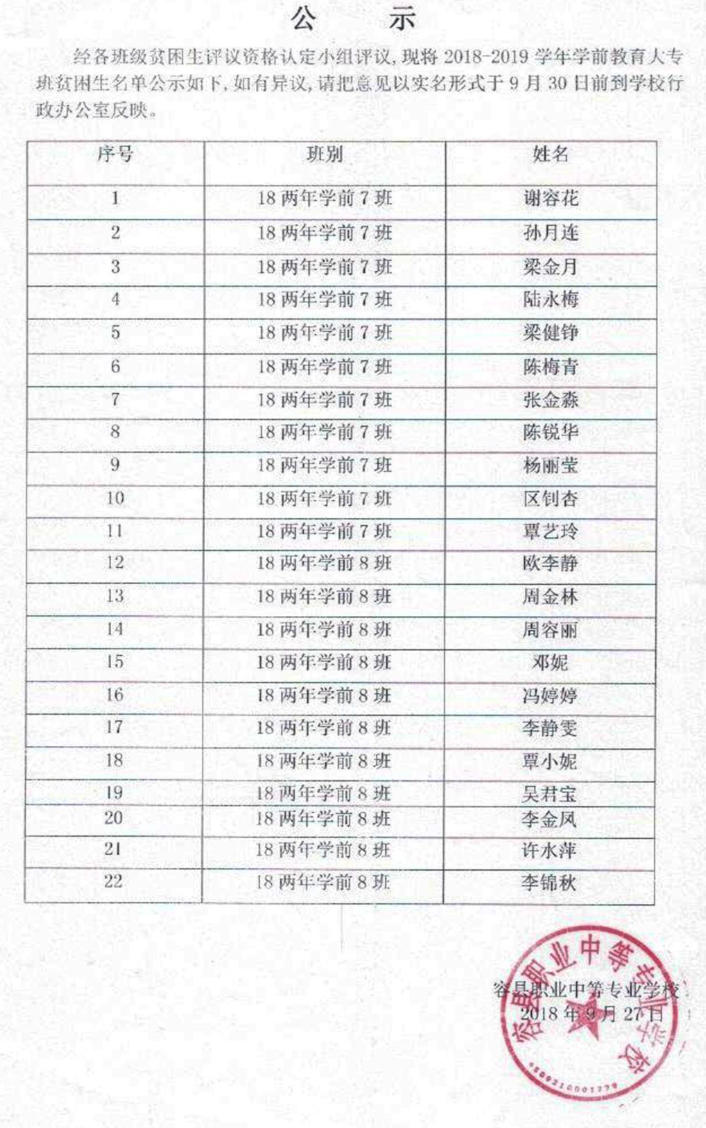 广西幼儿师范高等专科学校容县职业中等专业学校教学点现将2018~2019学年学前教育大专班贫困生名单公示如下,如有异议,请于2018年9月30日前,把意见以实名形式交到学校行政办公室。